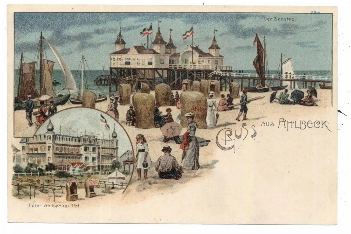 0-2255 HERINGSDORF - AHLBECK / Usedom, Lithographie, Hotel Ahlbecker Hof, Seesteg