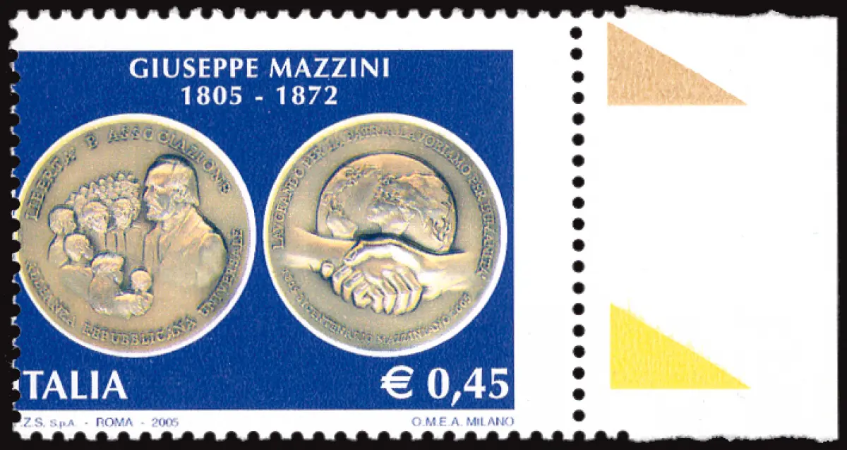 MNH - Vollgummi - Mazzini Euro 0,45 Nr. 2855 stark verschobene vertikale Verzahnung b. von f. - vorbeugendes Exemplar aus der letzten Reihe des Blattes, aufgrund der Verschiebung, ohne das I von Italien Cod. 948/17