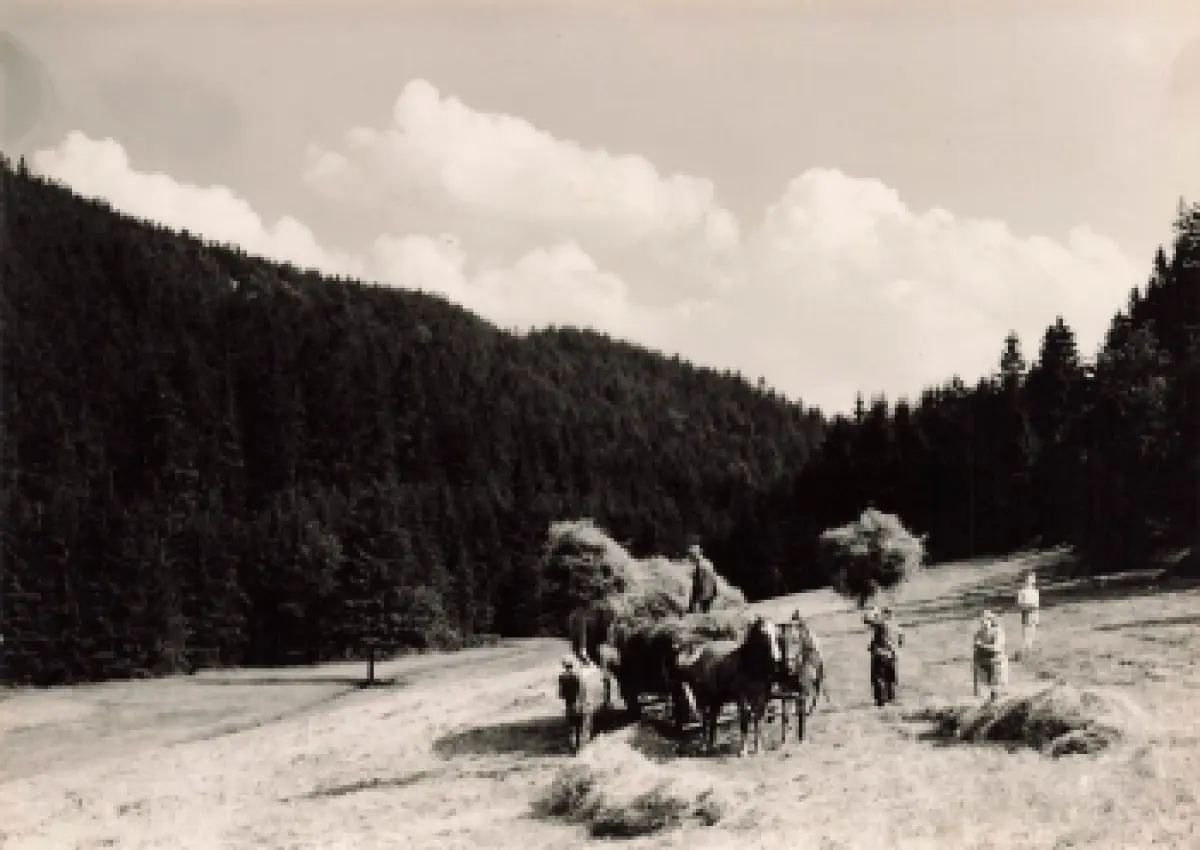 01744 Oberpöbel Dippoldiswalde Bauern bei der Heuernte Pferdegespann * um 1960