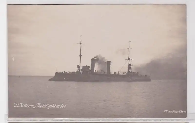 03103 Foto Ak kleiner Kreuzer 'Thetis' geht in See um 1925
