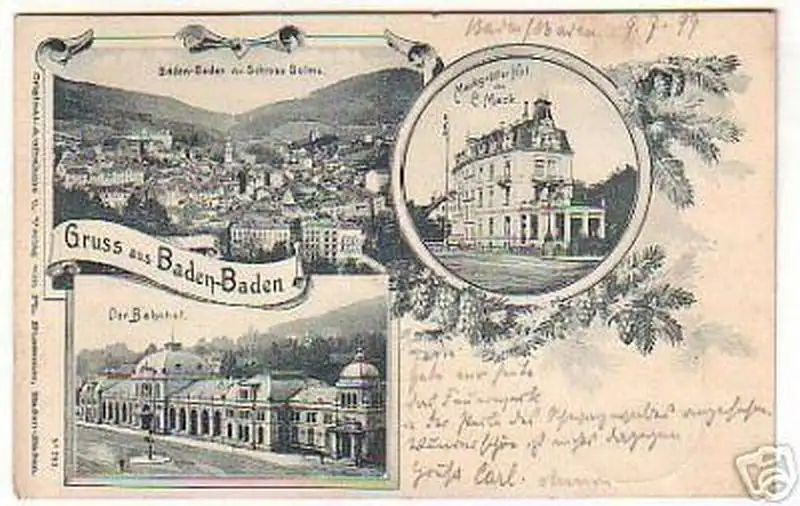 Baden-Baden von Schloss Solms, Markgräfler Hof von C.Mack, der Bahnhof, gelaufen (Marke ab), gute Erhaltung siehe Bild,