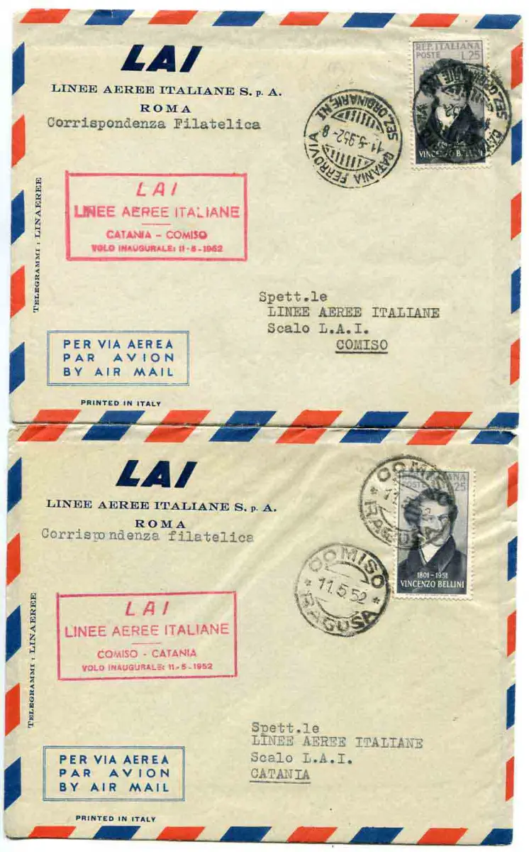 1. Flug LAI Catania/Comiso/Catania BUSTA - LAI Catania/Comiso/Catania - Zwei Aerogramme mit Ann. Spezial im roten Ordner (Kat. Pellegrini Nr. 197BB, 197CC) - Schön und ungewöhnlich - Kat. euro 130/200 n. 444/6