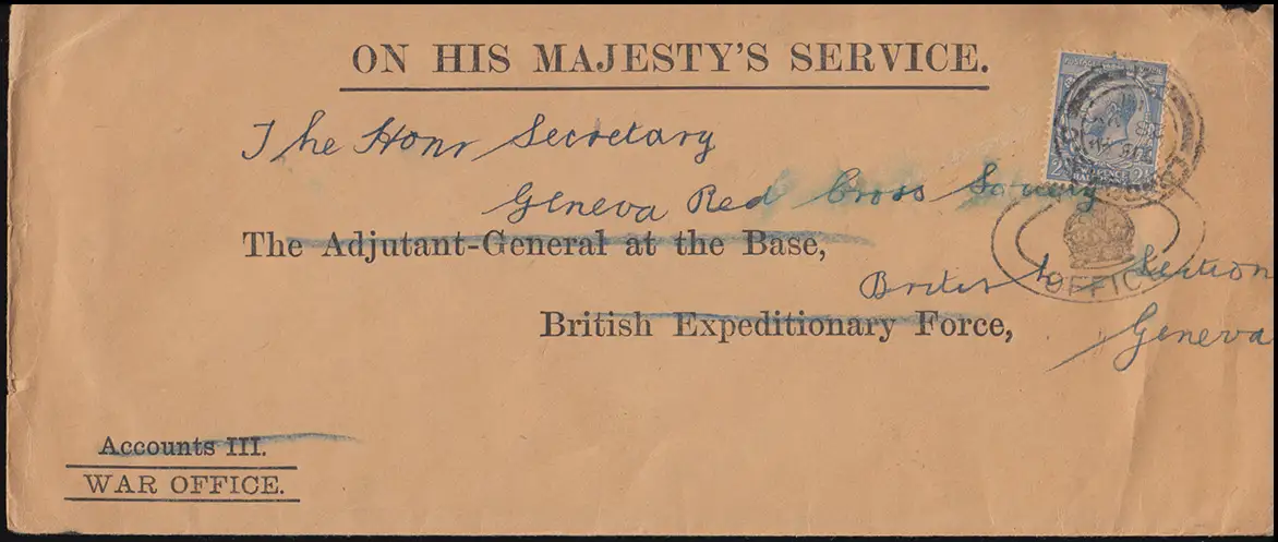 1. Weltkrieg WAR OFFICE - ON HIS MAJESTY'S SERVICE Brief London nach Genf