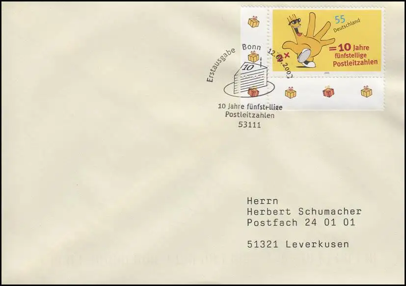 10 Jahre fünfstellige Postleitzahlen, FDC ESSt Bonn 12.6.2003