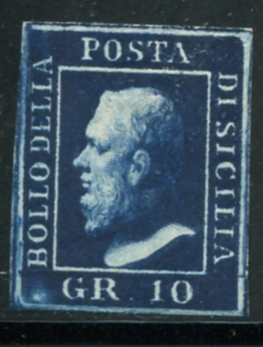 10 Körnung dunkelblau Nr. 12 sehr gut, gut marginiert ohne Gummi - Sizilien - 10 Körnung dunkelblau Nr. 12 sehr gut, gut marginiert und sehr frische Farbe - ohne Gummi - AD - Gebraucht Code 17/8