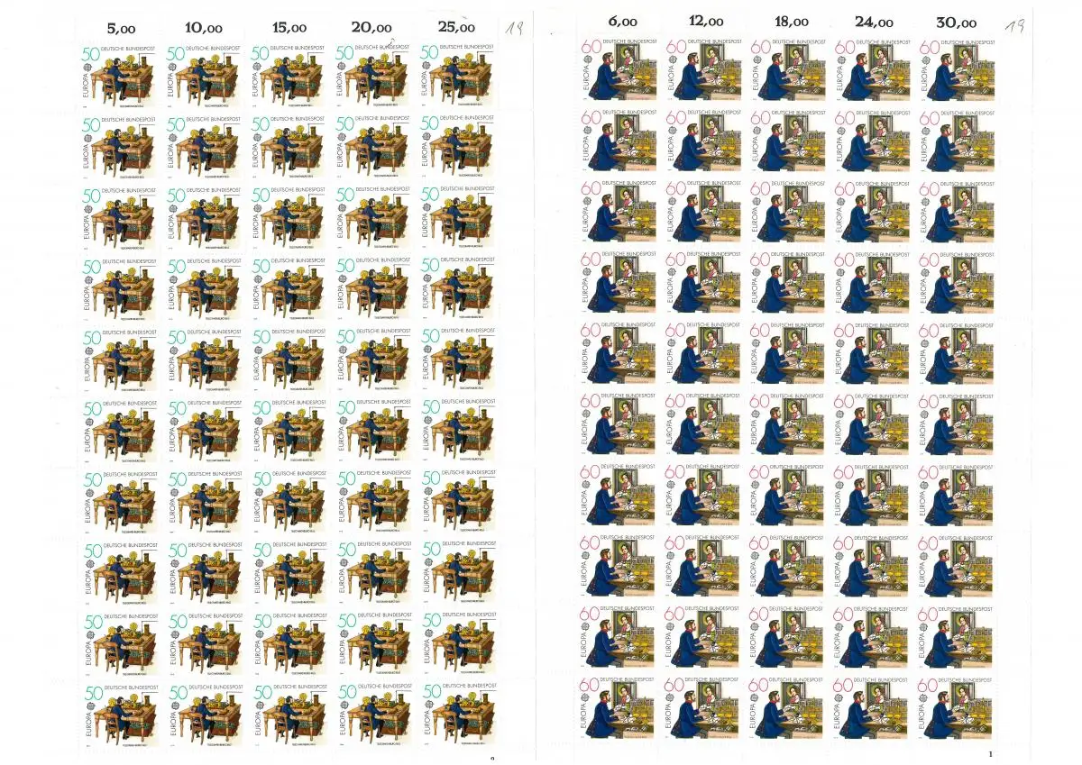 1011-1012 Europa - Postgeschichte, 2 komplette 50er-Bögen, Bogen-Satz FN 2/1 **