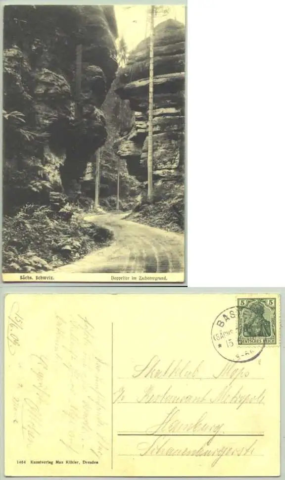 (1018597) Ansichtskarte. "Sächsische Schweiz - Doppeltor im Zscheeregrund". Sachsen. Beschrieben u. postalisch gelaufen mit Marke u. Stempel von 1909. PLZ-Bereich pauschal 01847