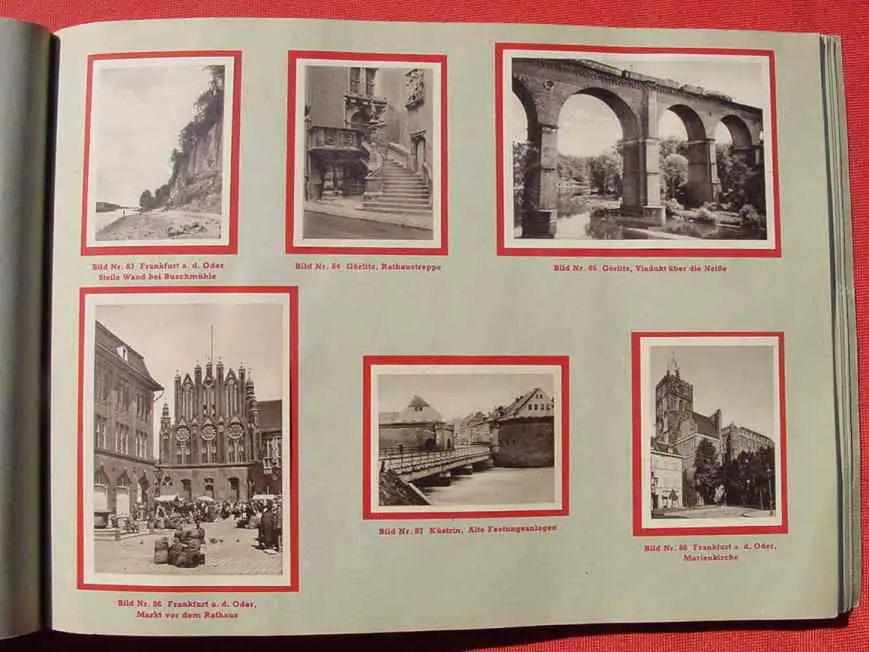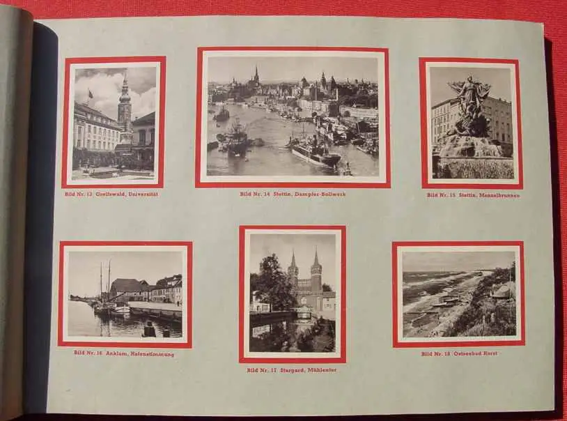 Unvergessliche Heimat. Sammelbilder-Album mit montiertem Deckelbild. Greiling-Sammelbilder, Serie B. Komplettes Werk mit 180 sauber eingeklebten Bildern mit Motiven aus deutschen Gauen vergangener Zeiten. Format ca. 34 x 24 cm. Auch ganzseitige Foto-Abbildungen dabei. Verlag Greiling Bilderstelle, Lensahn / Ostholstein