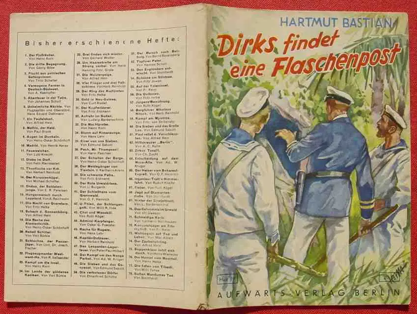 "Dirks findet eine Flaschenpost" Von Hartmut Bastian. Textzeichnungen von Hans Malchert. Originalheft Nr. 79 der Reihe "Aufwärts-Jugend-Bücherei". 20-Pfennig-Hefte, je 40 Seiten, mehrfarbige Umschlagbilder. Propagandaheft für die Jugend aus dem Aufwärts-Verlag Berlin 1940-1944. Komplettes Heft, TOP Zustand ! Siehe bitte Bild