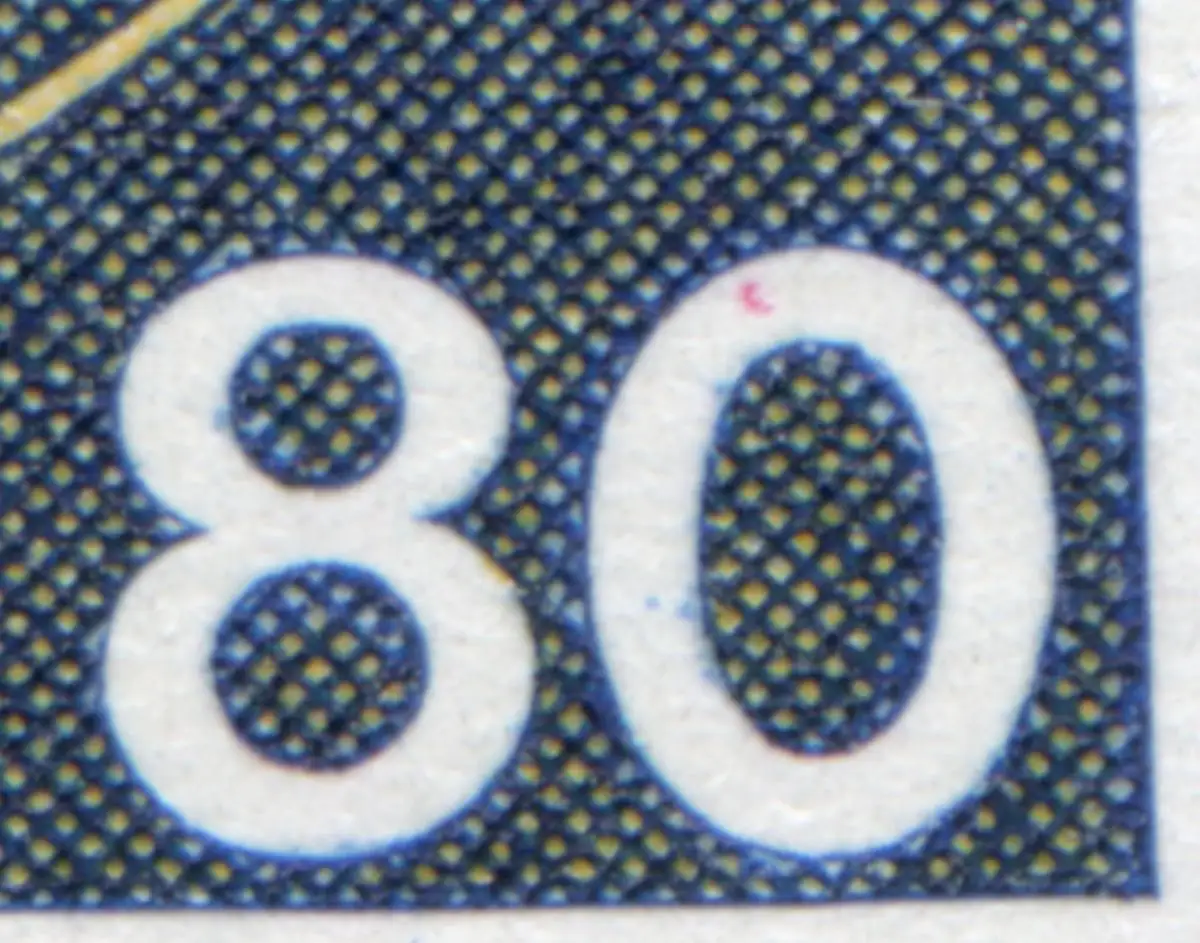 Eckrand-Viererblock unten rechts mit Formnummer 2 und zweimal mit dem MICHEL-Plattenfehler II: roter Punkt oben in der "0" der Wertangabe "80", Felder 39 und 40!