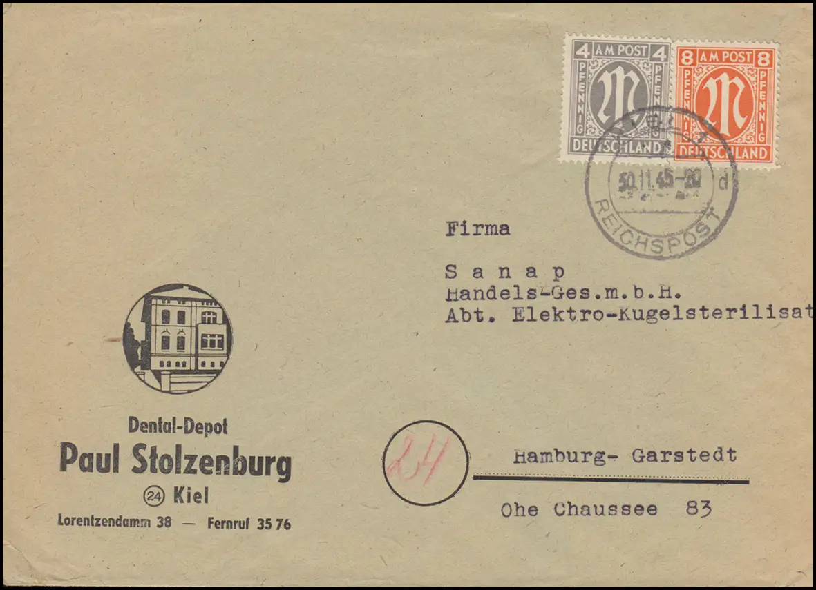 11+14 AM-Post 4+8 Pf. als MiF auf Brief Dental-Depot Stolzenburg KIEL 30.11.1945