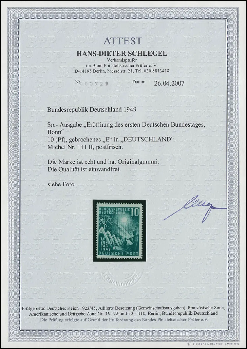 111II Bundestag 10 Pf. - PLF gebrochenes E, ** FA Schlegel BPP einwandfrei