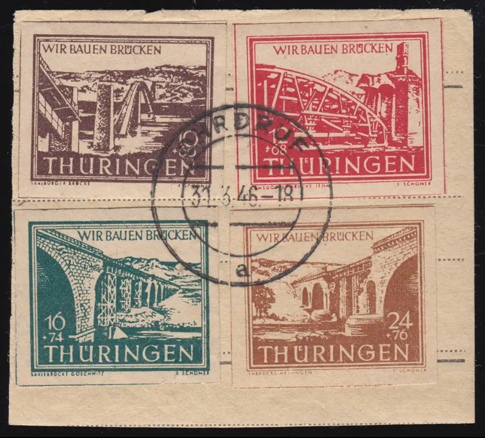 Brücken-Wiederaufbau-Satz auf Briefstück mit zentrischem Stempel Ohrdruf 31.3.46. Darunter die seltenen Farben 113by und 115cy, beide geprüft und rückseitig signiert Dr. Jasch BPP. Der MICHEL-Spezial 2023 bewertet alleine diese beiden Marken mit zusammen 365 Euro.