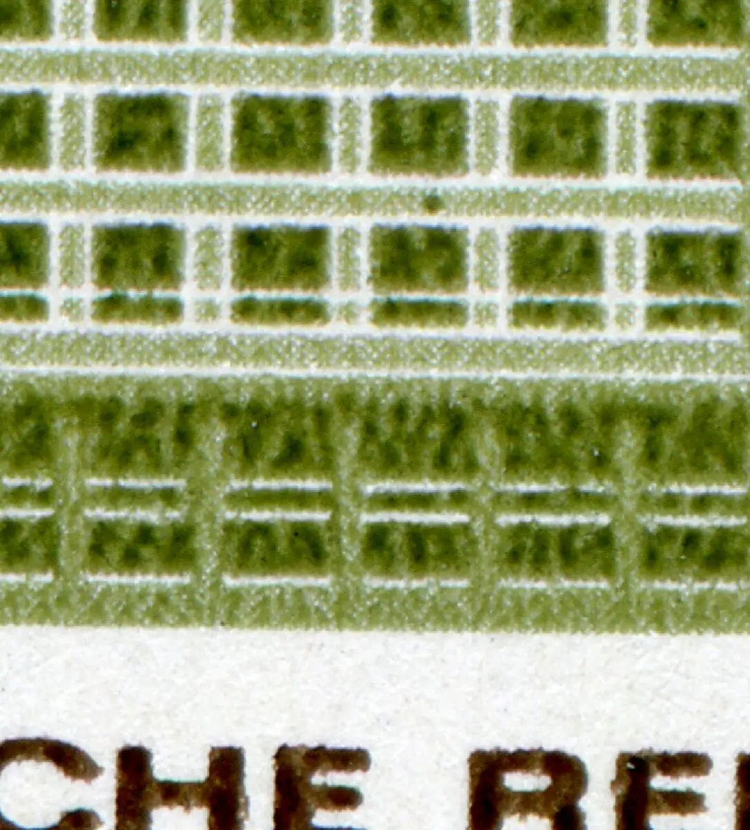 Zusammendruck aus Block 24 mit zwei RICHTER-Plattenfehlern: 25-Pfennig-Wert brauner Fleck über dem Portal und 40-Pfennig-Wert grüner Punkt über dem Fenster