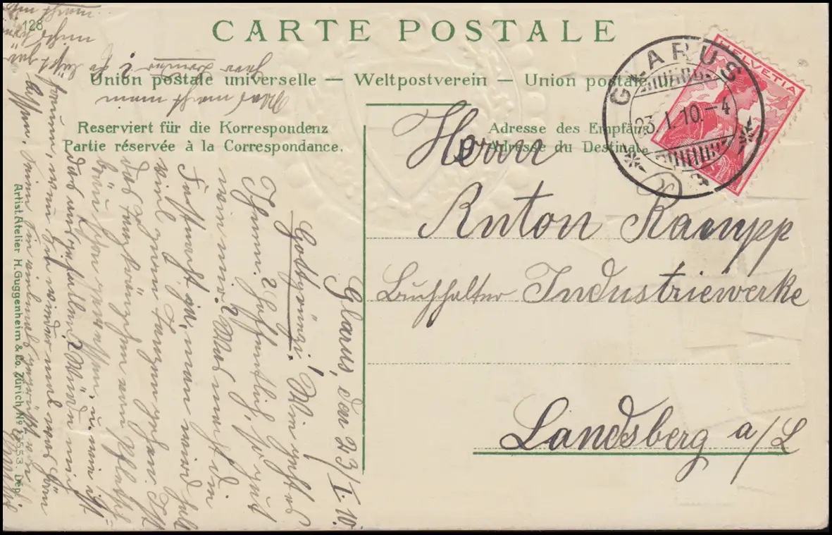 114 Helvetiabrustbild auf AK Briefmarken der Schweiz GLARUS 23.1.10 n. Landsberg