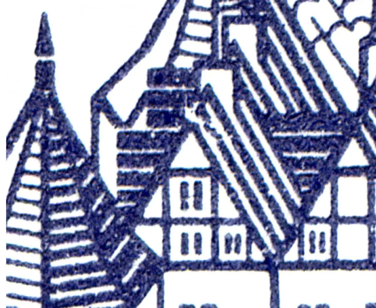 2 Anschriften, Briefmarkensammler/HAWID; PLF VII [PLF 532 V]: Dachfirst beim linken Mittelhaus verbogen, Feld 7
