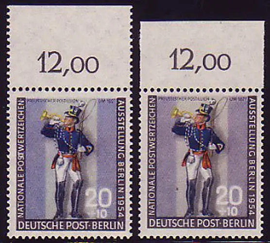 eine Marke mit durchgezähntem Oberrand/Farbstreifen links und rechts ultramarinblau sowie eine Marke mit NICHT durchgezähntem Oberrand/Farbstreifen links und rechts violettblau.