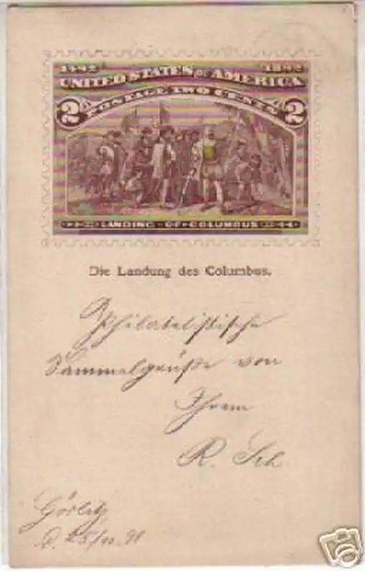 Christoph Kolumbus war ein genuesischer Seefahrer in spanischen Diensten, dem gemeinhin die Entdeckung Amerikas 1492 zugeschrieben wird. Karte mit aufgedruckter amerikanischer 2-Cent-Briefmarke anläßlich 400 Jahre der Landung des Columbus 1898 gelaufen guter Zustand (leichte Altersspuren), siehe Bild