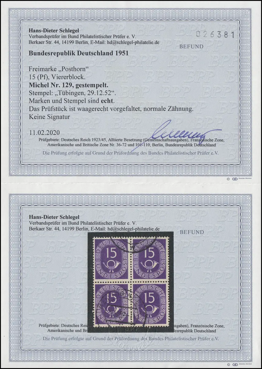 129 Posthorn 15 Pf im Viererblock gestempelt O, Befund Schlegel BPP