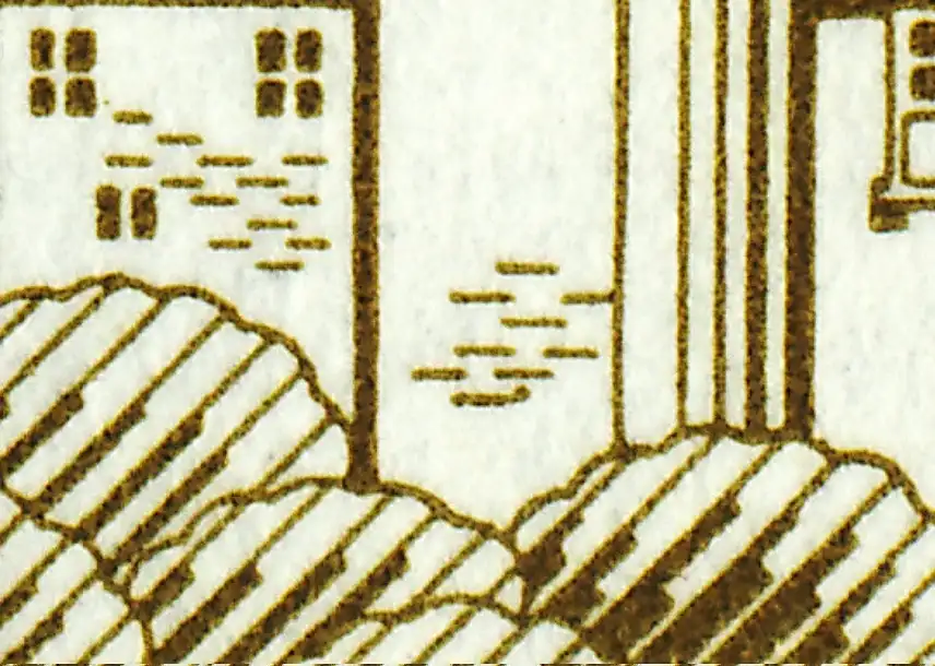 2. Deckelseite MICHEL-Kataloge, t normal stehend; PLF VI: unterster waagerechter Mauerstein im Turm verlängert, Feld 5; Klischee I: Zeilen auf gleicher Höhe