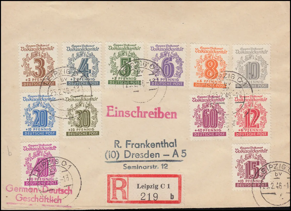 138-149Y Volkssolidarität, Satz mit 148b auf R-Brief LEIPZIG C 1 - 25.2.1946