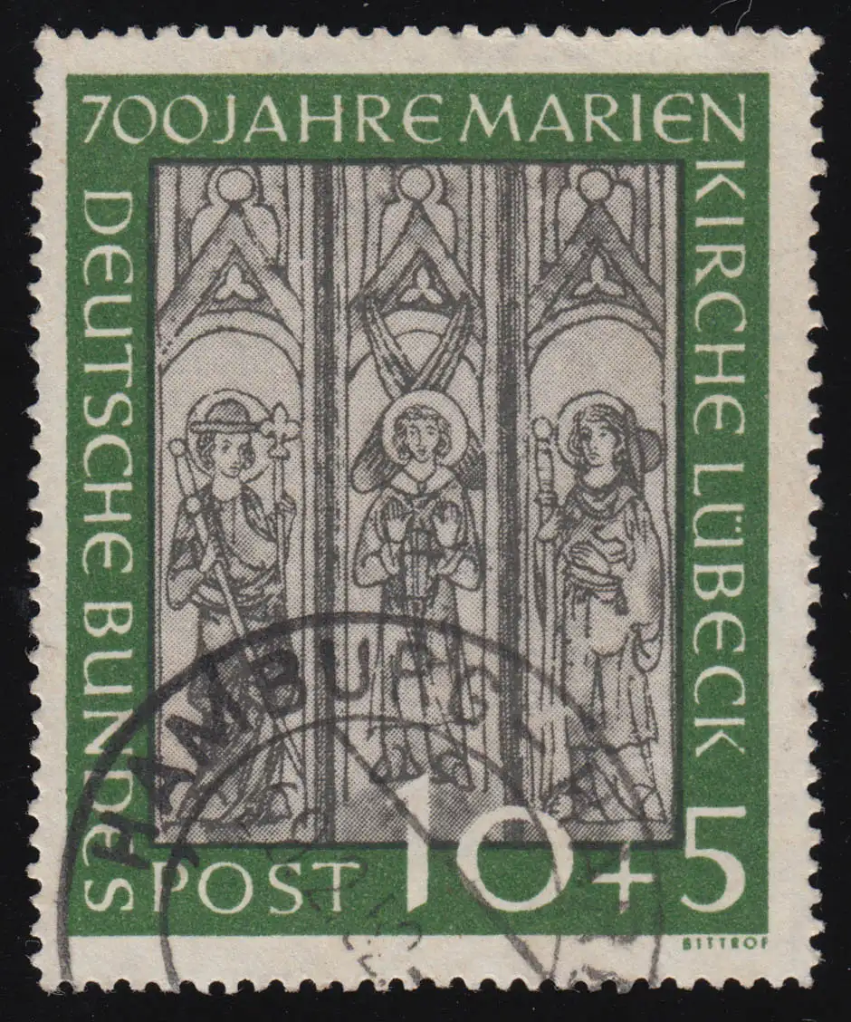 Seltener MICHEL-Plattenfehler I weißer Punkt links unten am rechten Fuß des R in KIRCHE, gestempelt HAMBURG 29.2.52