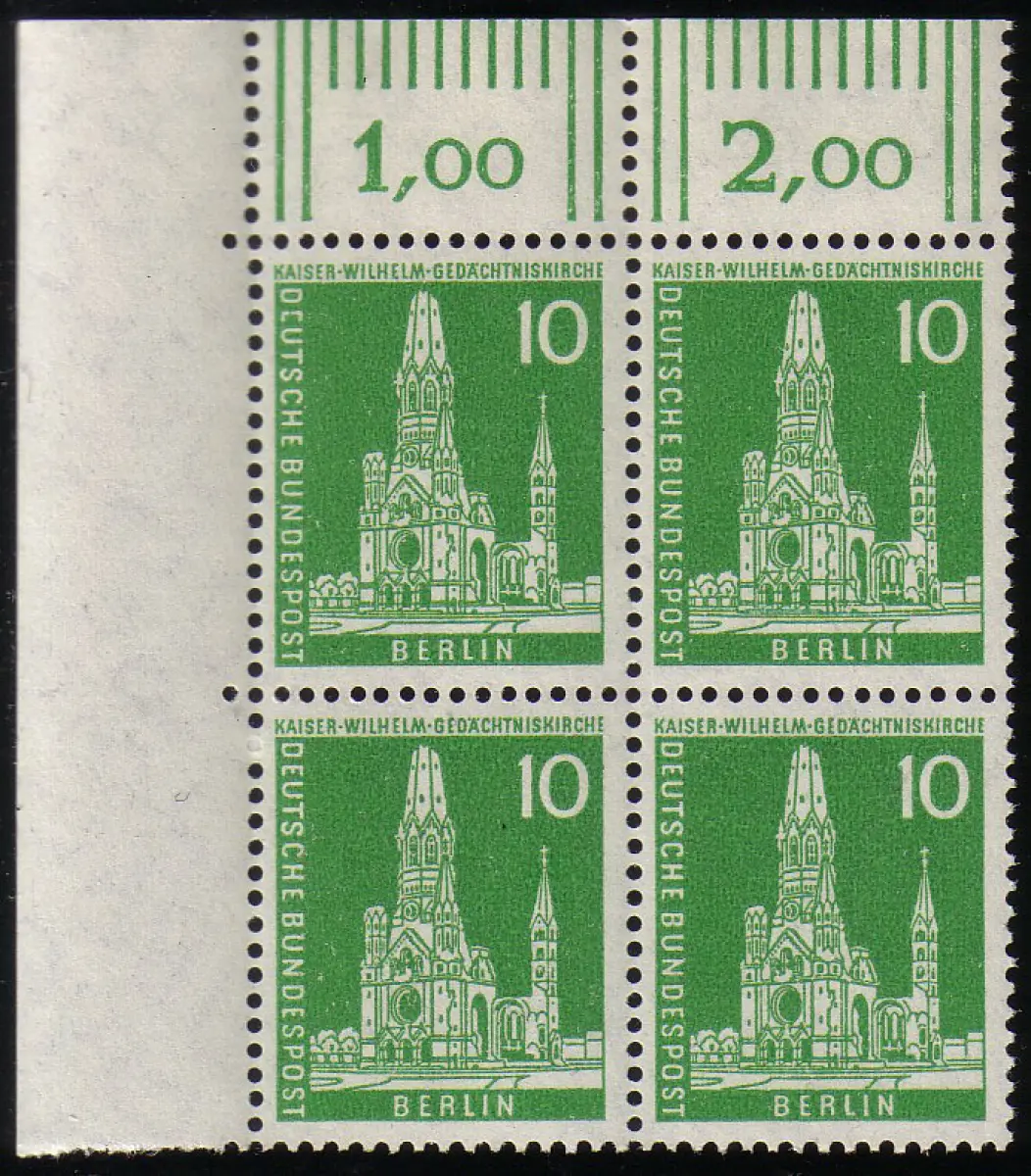 144 w Stadtbilder 10 Pf Eckrand-Viererblock oben links, postfrisch **