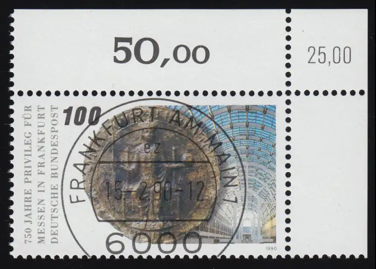Bogenecke mit amtlich zugedrucktem korrigierten Bogenwertzähler. Dieser wird von der Post rechts oben auf dem Bogen nach erfolgter Bogenstempelung angebracht, um der Tatsache Rechnung zu tragen, dass bei der Stempelung einige Marken nur am Rand vom Stempel getroffen werden und als Ausschuss vernichtet werden.