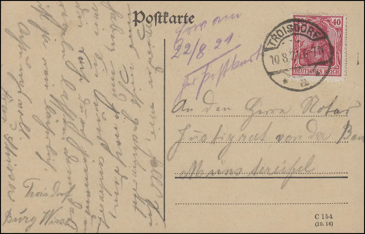145II Germania EF Postkarte von TROISDORF a - 10.8.21 nach Münstereifel