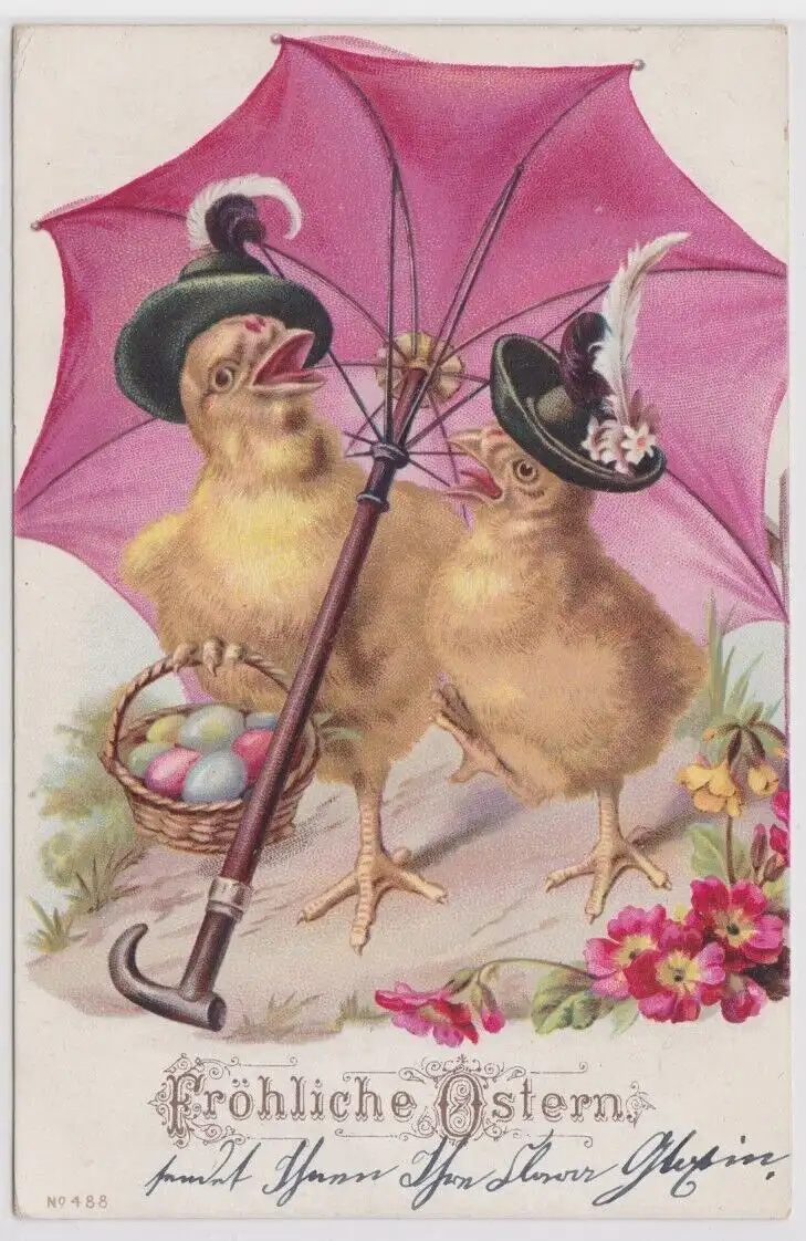 14698 Präge AK Fröhliche Ostern 2 Küken mit Hüten unter Regenschirm 1900