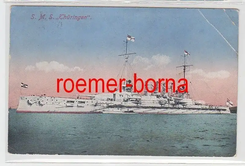 Motiv S.M.S. Thüringen, gelaufen mit Marineschiffspoststempel, gute Erhaltung (Eckbug) siehe Bild,