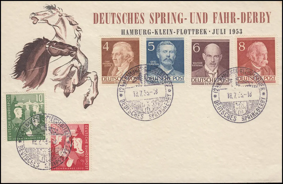 Jugendmarken 1952 Bund und vier Männer Berlins auf Sonder-Schmuck-Umschlag vom Deutschen Spring- und Fahr-Derby in Hamburg-Klein-Flottbek, entsprechender Sonderstempel 18.7.1953 - sehr dekorativ!