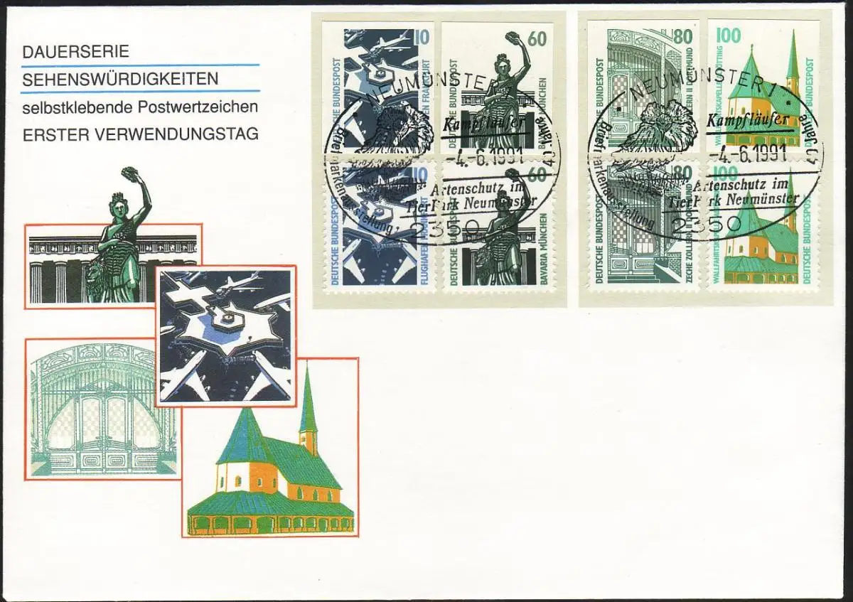 beide Sätze mit Ersttagssonderstempel der selbstklebenden Ausgabe aus Markenheftchen, Neumünster Naturschutz im Tierpark 4.6.1991