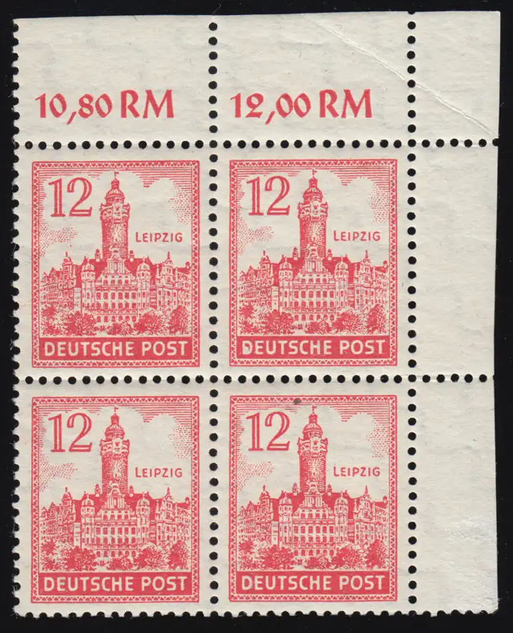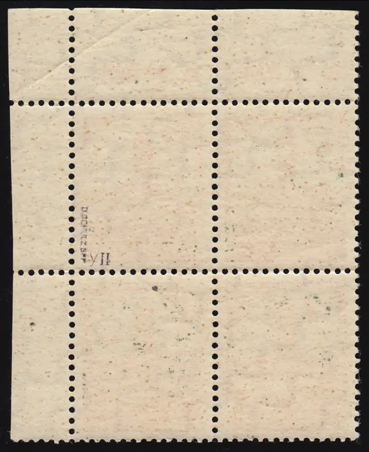ungefaltet und auch nicht angetrennt: Eckrand-Viererblock ober rechts mit MICHEL-Plattenfehler II: Bogen des D in DEUTSCHE beschädigt, Feld 10