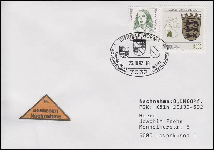 1586 Baden-Württemberg, MiF NN-Brief SSt Sindelfingen Jubiläum Wappen 23.10.1992