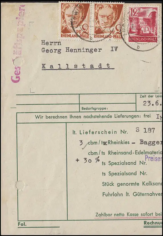Frankatur auf Geschäftspapiere (Rechnungsbrief) über Baggergut nach Kallstadt. Frankatur knapp aufgeklebt laut Abbildung