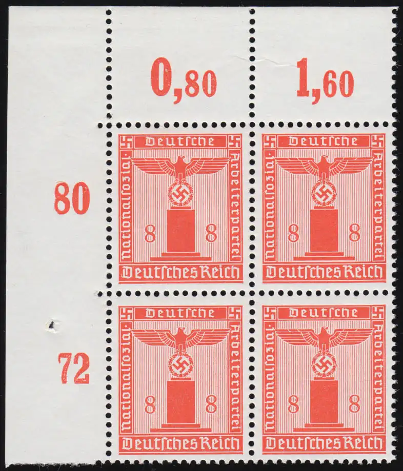 160y Dienstmarke 8 Pf. als Eckrand-Viererblock oben links, ungefaltet, **