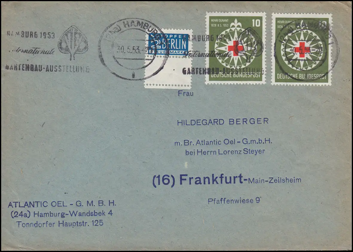 164 Dunant / DRK mit Notopfer/ Leerfeld und Rand MeF Brief HAMBURG 30.5.1953