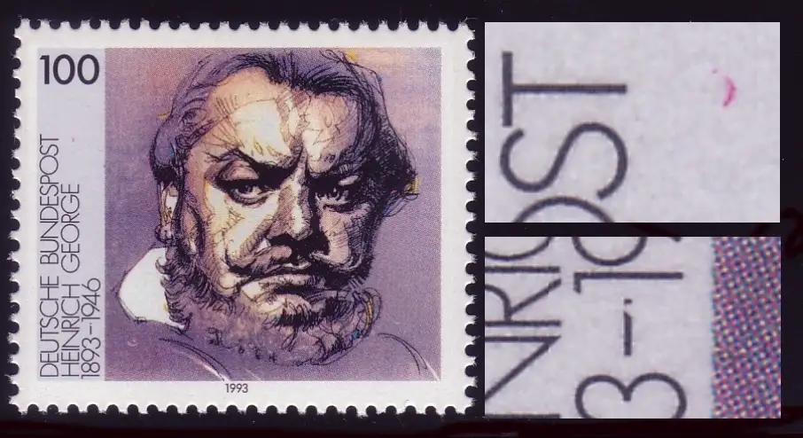 Doppel-Plattenfehler: roter Strich unter dem T von BUNDESPOST und gebrochener Bindestrich bei 1893 - 1946 zusammen auf Feld 10