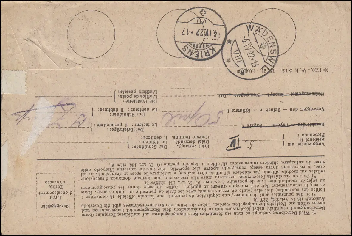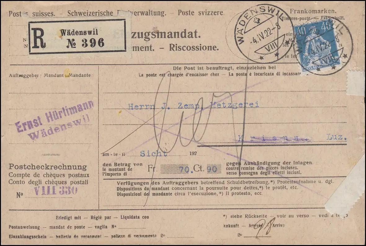 170a Sitzende EF Einzugsmandat / NN-Einschreiben WÄDENSWIL 4.4.1922