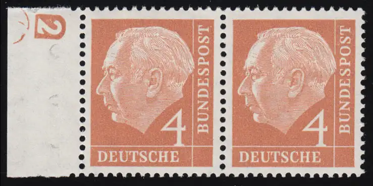 178 Heuss 4 Pf Randpaar mit Druckerzeichen DZ 2 negativ, ungefaltet, **