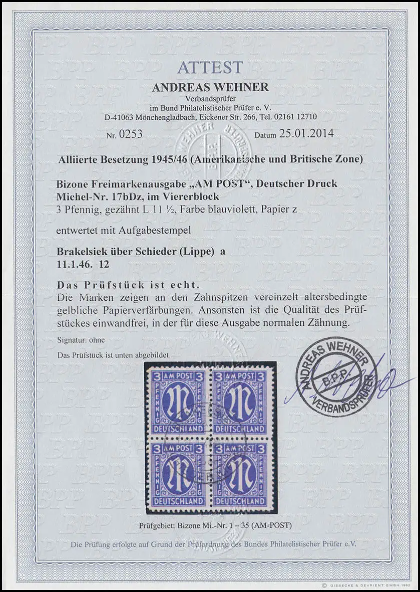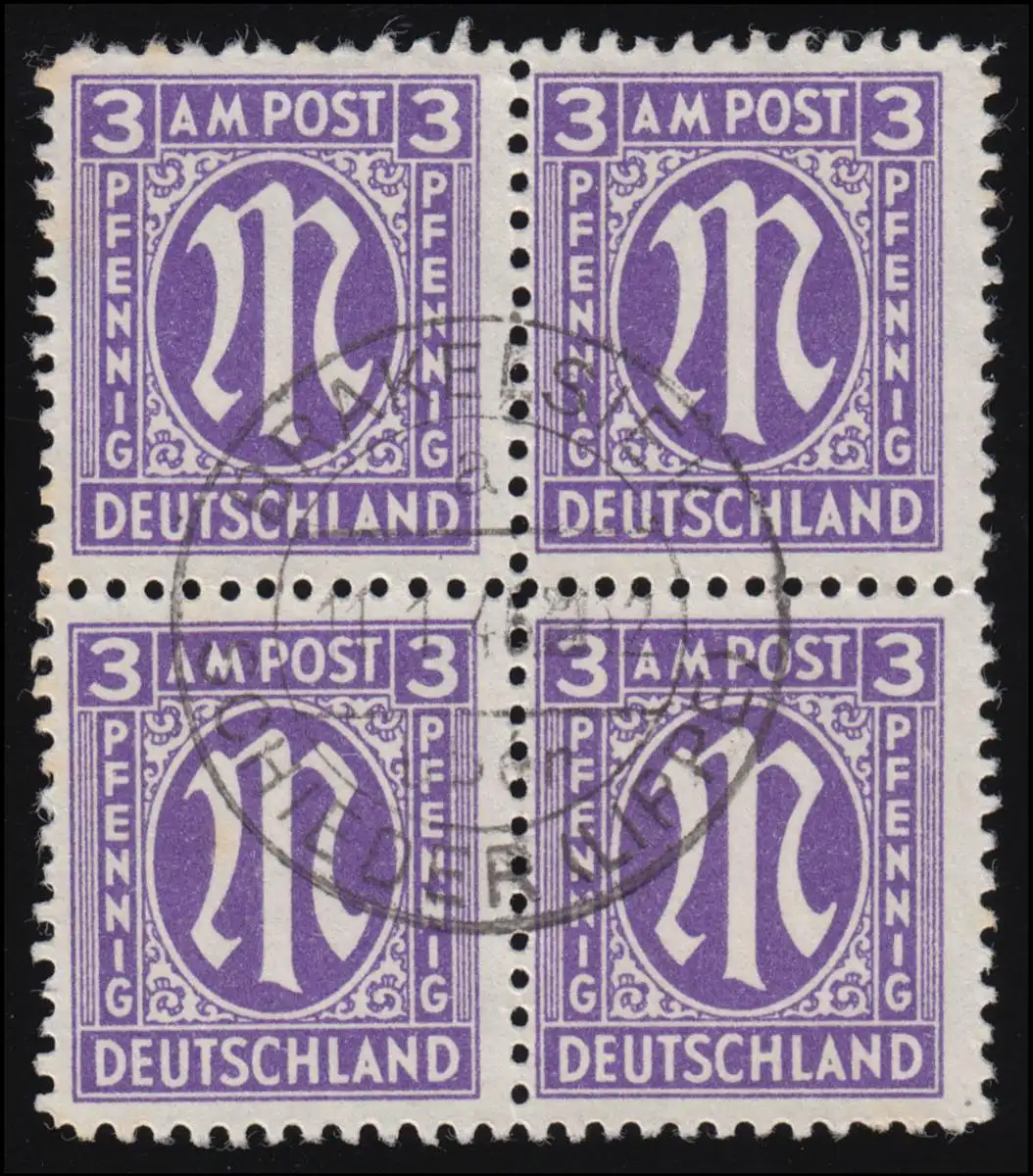 17bDz AM-Post 3 Pf. im Viererblock gestempelt Brakelsiek 11.1.46, FA Wehner BPP