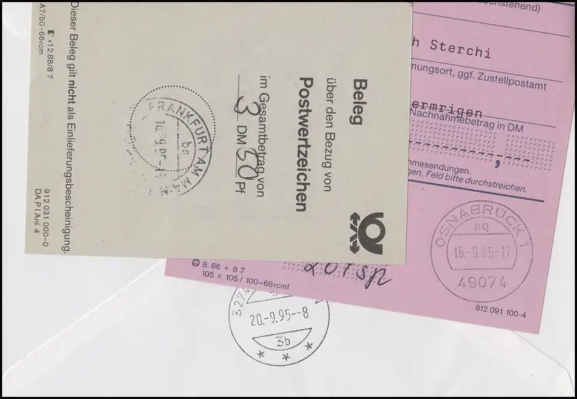 in die Schweiz mit Ankunftsstempel Hermrigen 20.9.95, mit Einlieferungsschein und Postwertzeichenquittung über 3,50 DM