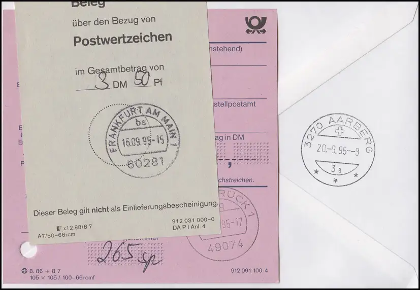 in die Schweiz mit Ankunftsstempel Aarberg 20.9.95, mit Einlieferungsschein und Postwertzeichenquittung über 3,50 DM