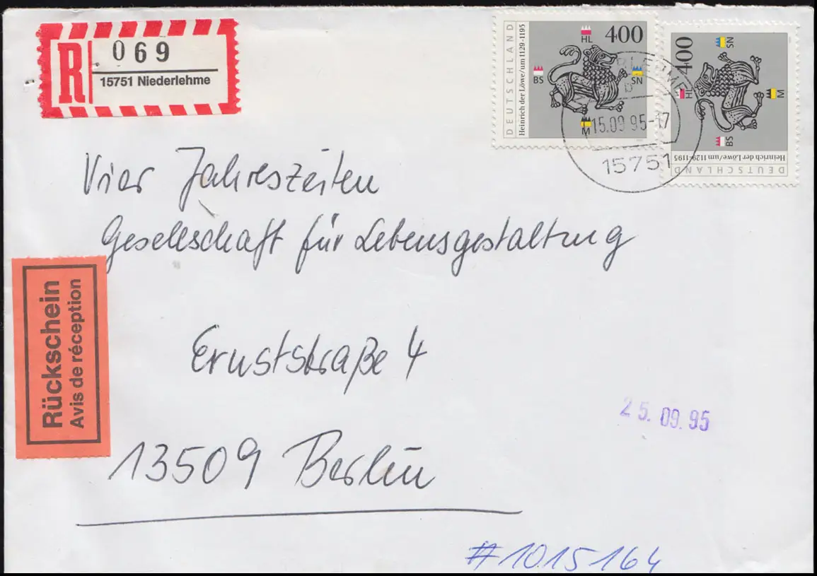 1805 Heinrich der Löwe als MeF auf Rückschein-R-Brief NIEDERLEHME 15.9.1995