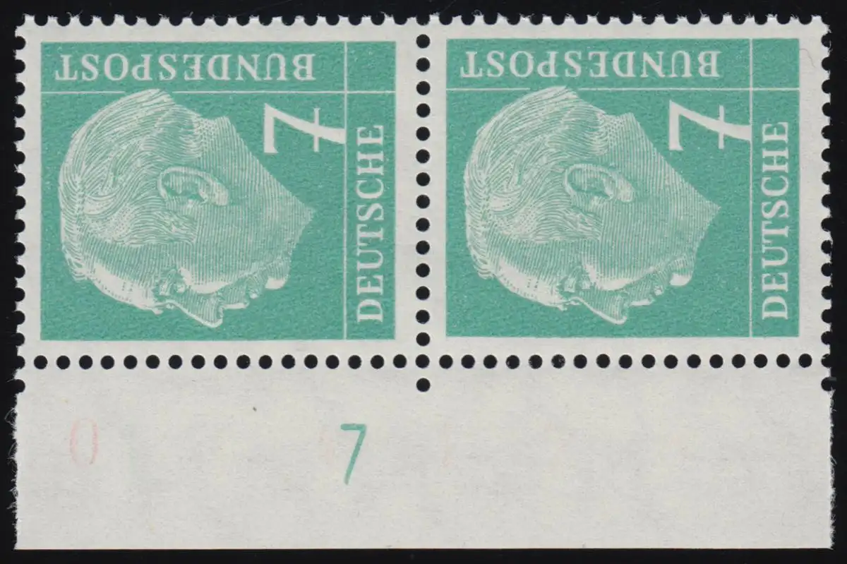 181y Lumogen DZ Heuss 7 Pf. Randpaar mit Druckerzeichen DZ 7, ungefaltet, **