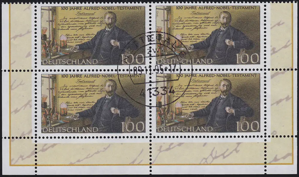 1828 Alfred-Nobel-Testament: Viererblock unten, zentrischer Vollstempel NETTETAL