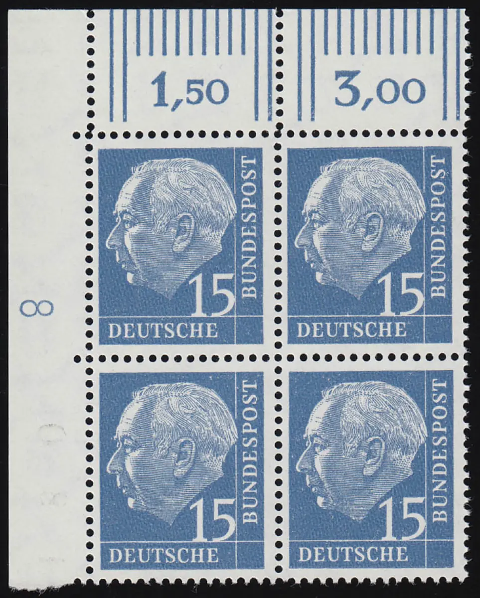 184xw Heuss 15 Pf ER-Vbl. o.l. mit DZ 8 positiv neben Feld 1, **
