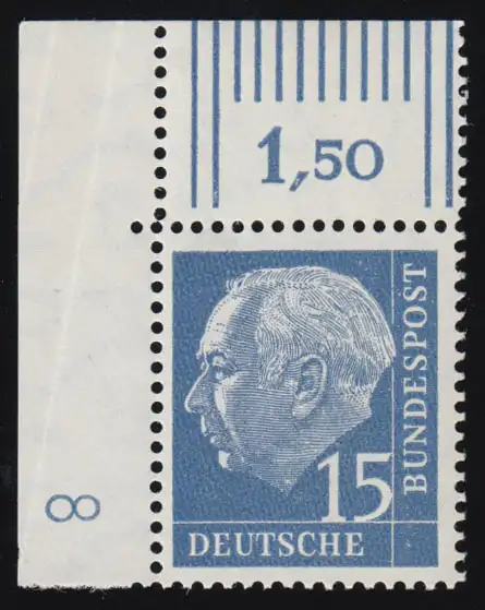 184xw Heuss 15 Pf Ecke oben links mit DZ 8 positiv, ungefaltet, Rand bügig, **