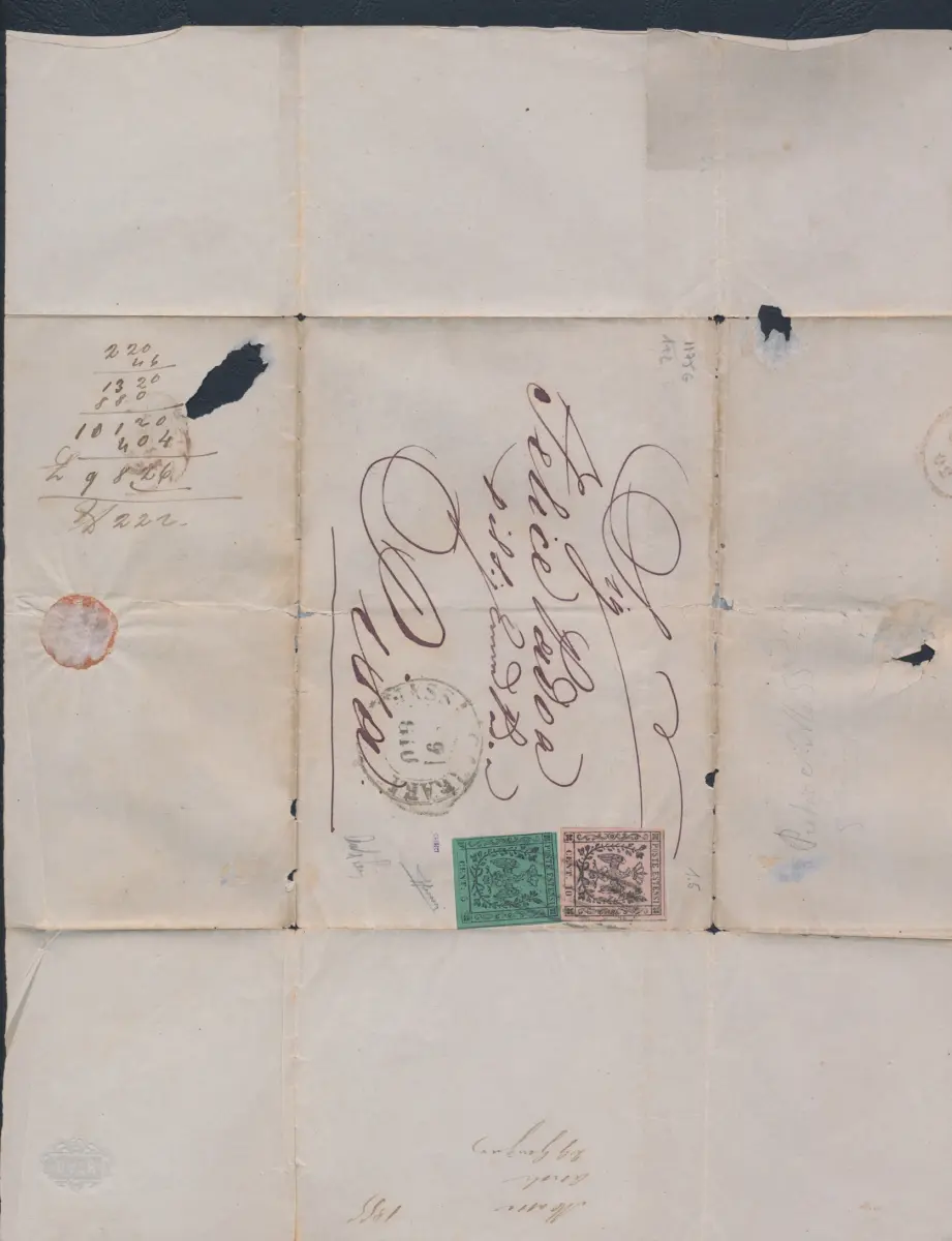 1852 MODENA, Nr. 1 und 2 auf Umschlag für Pisa, gute/sehr gute Ränder, signiert Sorani, Stempel Chirici, Signatur Angelo De Simoni Sächsischer Katalog Euro 1400 Gutscheine